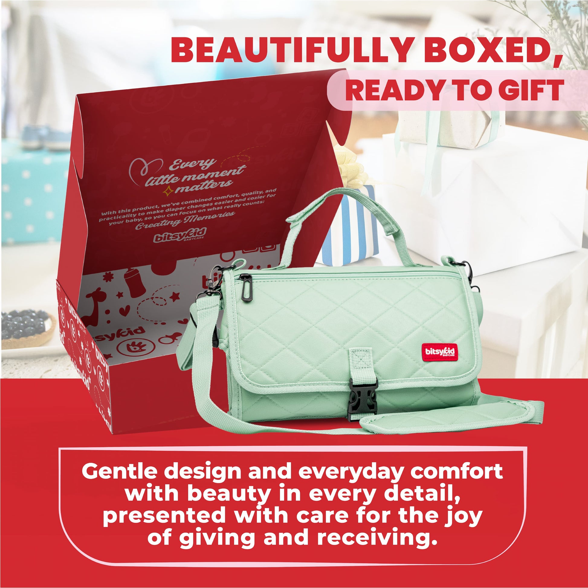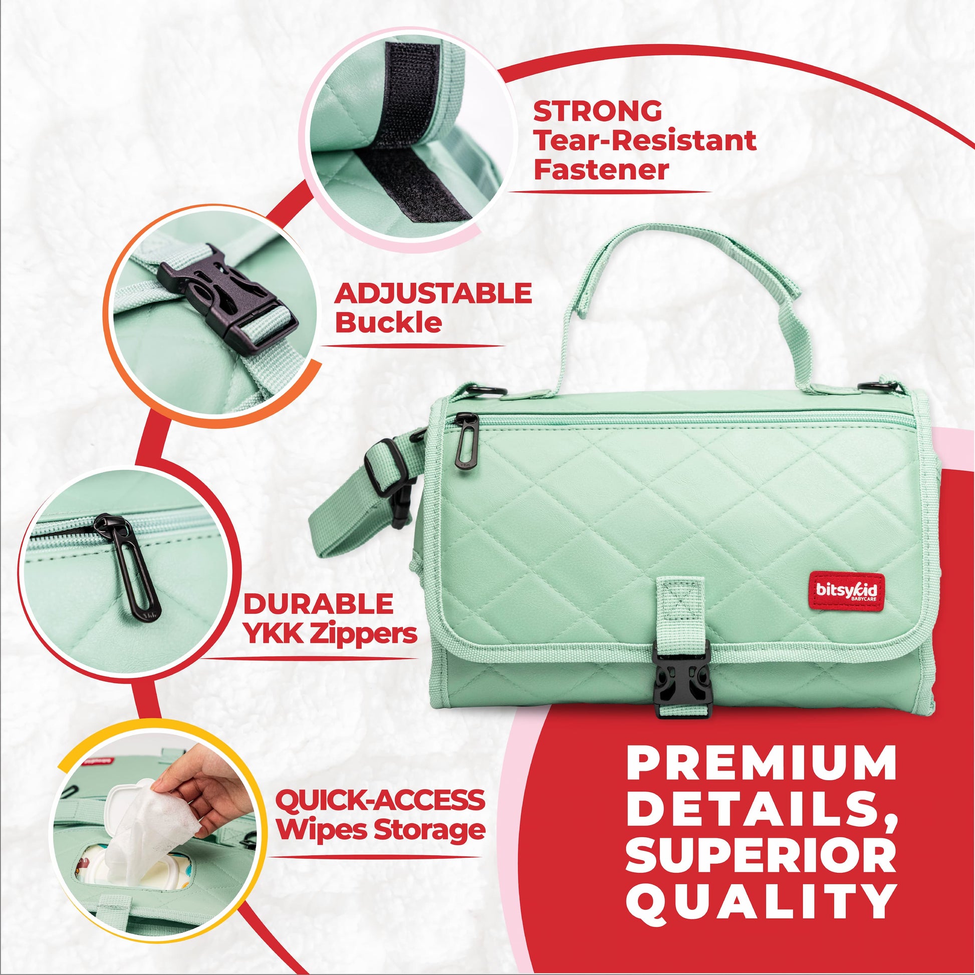 Bitsykid Portable Diaper Changing Pad – Extra-Cushioned Travel Mat with Built-In Wipes Pocket – Waterproof, Easy to Clean, Gift-Ready (Seafoam Green)